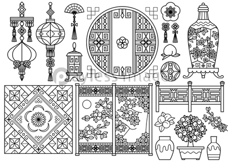 中国風 中華風 装飾品 ラインアート ぬりえ 線画 ちょうちん 提灯 行灯 行燈 桃 壺 花瓶 屏風 柵 中国 中華 白背景 飾り 置物 オーナメント インテリア デコレーション イラスト素材 デザイン素材 イラスト デザイン カットイラスト アート グラフィック イメージ ワンポイントイラスト ワンポイント クリップアート 白黒 塗り絵 ぬりえ モノクロ モノクローム モノトーン 一色 単色 木 花 植物 模様 セット ベクターイラスト ベクターアート ベクター