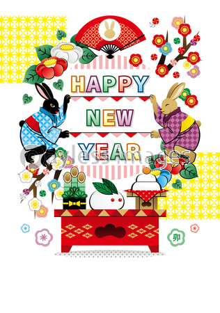 HAPPY NEW YEAR 兎 ウサギ うさぎ 卯年 卯 卯年イラスト 卯年年賀状 動物 年賀状 年賀 賀詞 はがきテンプレート 年賀状素材 年賀素材 年賀状テンプレート 新年 お正月 正月 縁起物 ポストカード グリーティングカード テンプレート 祝賀 お祝い 祝う 祝 おめでたい おめでとう イラスト デザイン アート グラフィック 可愛い かわいい カワイイ ファンシー ポップ キャラクター お洒落 華やか カラフル 雪兎 雪うさぎ ゆきうさぎ 鏡餅 門松 着物 和服 扇 扇子 日本 和風