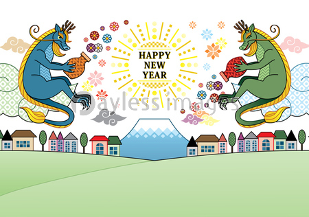 龍 竜 ドラゴン 辰 辰年 辰年イラスト 辰年年賀状 辰年デザイン 十二支 干支 動物 年賀状 年賀 賀詞 年賀状素材 年賀素材 新年 挨拶状 イラスト素材 デザイン素材 ポストカード グリーティングカード 祝賀 お祝い 祝う 祝 おめでたい おめでとう イラスト デザイン キャラクター カジュアル 華やか カラフル 白背景 白地 HAPPY NEW YEAR 富士山 山 花 友達 仲間 仲良し コンビ 風景 景色 ベクター ベクターイラスト ベクターアート