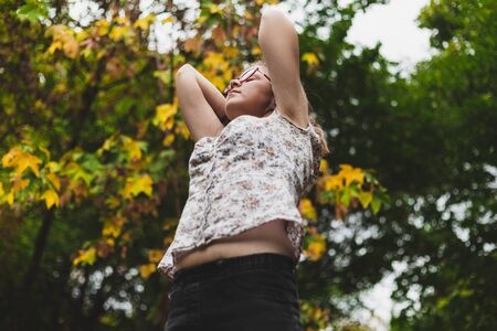 • Beautiful young woman relaxing in the park standing with both hands behind her head 但���� Pretty girl wearing glasses and a white floral shirt breathing fresh air in naturerf10150554549