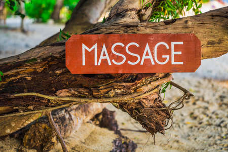 Old signboard with the inscription, massage, on a tropical beach. Thailandrf1040625261