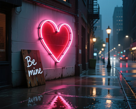 A Valentines Day illustration of a red neon heart on a wall, with a wooden sign saying Be mine on a rainy city street.rf10259127452