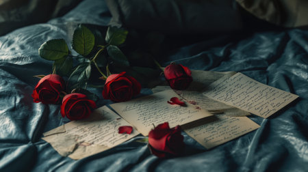 Heartbreak depicted with torn love letters and broken roses on a vacant bed, reflecting the sorrow and emotional fallout of love.rf10254015123