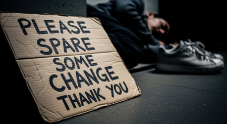 A cardboard sign with a plea for spare change sits beside a person in worn shoes, symbolizing poverty and the struggle of homelessness in urban life.rf10258585429