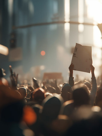 Participants join together, displaying signs with passion as a warm glow surrounds the scene.rf10256281761
