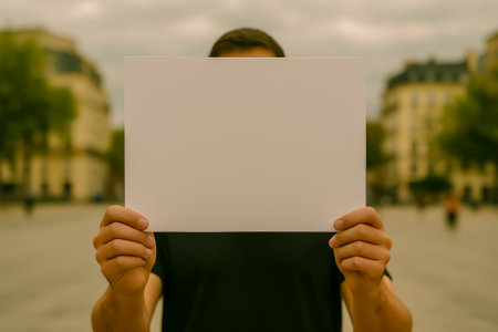 A man holds a blank white sheet of paper in a busy urban arearf10256007272
