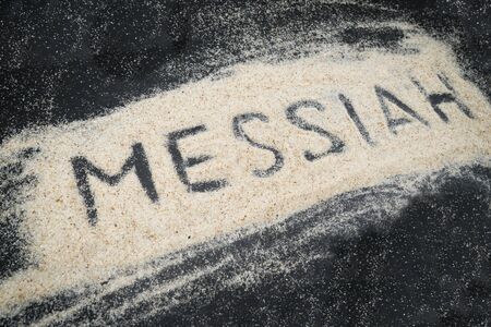 Closeup of MESSIAH text written on white sand with black wooden backgroundrf10141692024