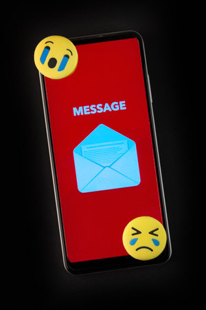 MESSAGE on smart phone screen with smiley face and envelope on black backgroundrf10221333868