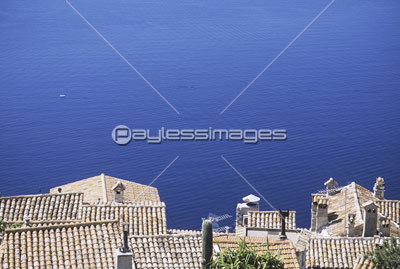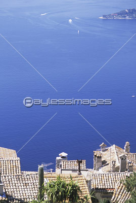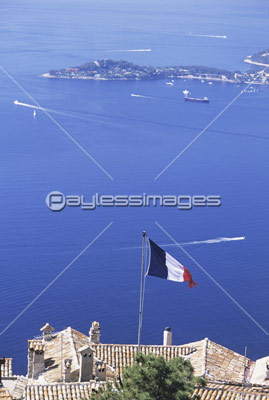 エーズ エズ コートダジュール トリコロール バカンス フラッグ フランス フランス共和国 ブルー マリンブルー ヨーロッパ リゾート レンガ 屋根 夏 家並 快晴 海 海岸 海岸線 海面 街並 旗 空 国旗 紺碧 自然 晴れ 青 青空 船 爽快 地中海 町並み 眺望 避暑地 風 風景 湾