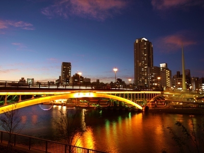 bridge city evening night orange osaka river scene urban view オレンジ ブリッジ 黄昏 街 橋 景色 照明 川 大阪 都会 風景 夜 夜景 夕景 夕焼け 夕方