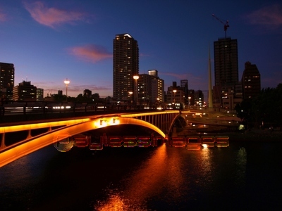 bridge city evening night orange osaka river scene urban view オレンジ ブリッジ 黄昏 街 橋 景色 照明 川 大阪 都会 風景 夜 夜景 夕景 夕方