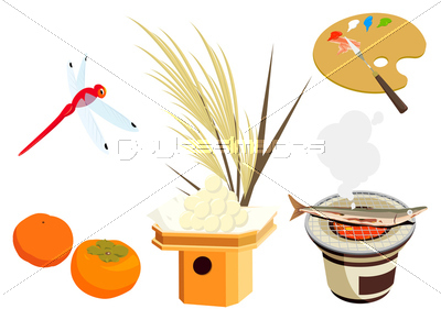 イラスト 季節 秋 イベント 十五夜 月見 ススキ 団子 月見団子 トンボ 柿 食材 絵画 パレット 芸術 ペインティングナイフ 秋刀魚 サンマ 七輪 魚 煙 素材 とんぼ すすき カキ 昆虫 フード さんま 秋の味覚 サカナ さかな かき フルーツ 果物 虫 くだもの 食べ物