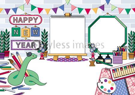 画家 芸術家 アーティスト クリエーター クリエイター クリエイティブ 絵師 アトリエ 美術 芸術 アート 画材 イーゼル 額縁 鉛筆 色鉛筆 絵筆 筆 画筆 クレヨン パレット スケッチブック つけペン インク 観葉植物 ガーランド ベレー帽 蛇 へび ヘビ 巳年 蛇年 巳年イラスト 巳年年賀状 十二支 干支 年賀状 年賀 年賀状素材 年賀素材 素材 新年 年賀イメージ 祝賀 お祝い 祝う 祝 おめでたい おめでとう 賀詞 HAPPYNEWYEAR イラスト デザイン グラフィック ファンシー 可愛い かわいい カワイイ ポップ フォトフレーム 写真スペース 写真フレーム 写真枠 フォトスペース フレーム 枠 コピースペース 余白 空白 ベクター ベクターイラスト ベクターアート 挨拶状 ポストカード NEW YEAR CARD グリーティングカード