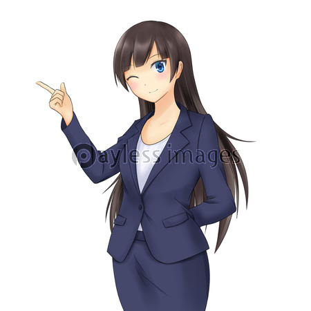 女性 若い 20代 かわいい 一人 日本人 ロングヘア ビジネス OL 受付 事務 店員 スタッフ 社員 スーツ スカート 青 笑顔 ウインク 紹介 案内 説明 解説 斜め向き 上半身 ウエストアップ アニメ マンガ 萌え ワンポイント