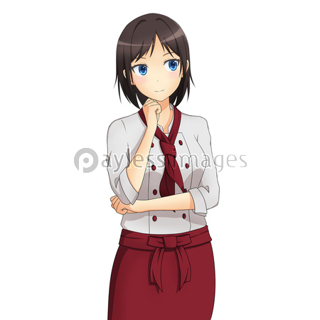 女性 若い 20代 かわいい 一人 日本人 レストラン 飲食店 カフェ ウエイトレス 店員 スタッフ コックコート スカーフ 赤 白 笑顔 考える 悩む 正面 上半身 ウエストアップ アニメ マンガ 萌え