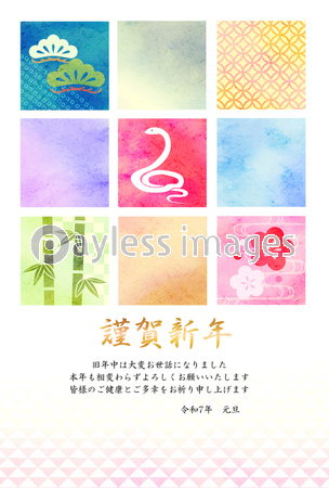 へび ヘビ 蛇 巳年 年賀状 年賀素材 年賀状素材 干支 十二支 白蛇 縁起物 はがき テンプレート 和風 和 和風素材 和風イメージ 水彩 かわいい 挨拶状 グリーティングカード メッセージカード ポストカード 正月 イラスト 和柄 年賀 はがきテンプレート コピースペース 文字スペース メッセージスペース 吉祥文様 松竹梅 松 竹 梅 カラフル 明るい 花 うろこ文様 日本 賀詞 文字 謹賀新年