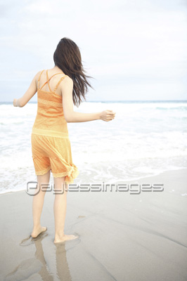 「波打ち際に立つ女性の後姿」はフリーイメージです。