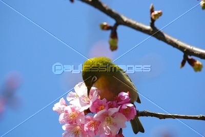 「立春寒桜の花とメジロ」はフリーイメージです。メンバー登録で無料でダウンロードできます。