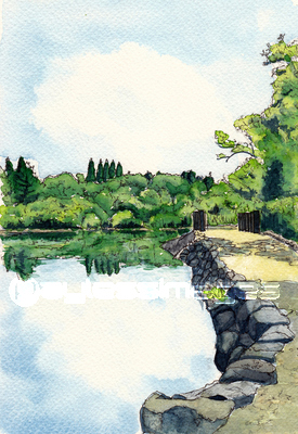 水彩画 新潟県 妙高 妙高高原 いもり池 イモリ池 池 湖沼 高原 池の平 青空 新潟 日本 中部地方 中部 北陸地方 北陸 甲信越地方 信越地方 北信越地方 風景 自然 空