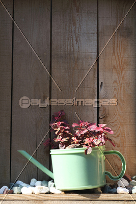 ガーデニング ガーデン 飾る 如雨露 じょうろ 植物 プラント 花 葉 石 小石 砂利 木 ウッド 庭 木目 板 壁 外壁 壁面 お花 フラワー