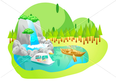 旅行 ハイキング お出かけ 観光 湖 自然 山登り 滝 山 山々 風景 背景 ボート カヌー ドライブ スワンボート ピクニック 遠足 トラベル 避暑地 キャンプ イラスト 川 水 水流 水しぶき 水飛沫 船 運転 河