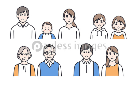 家族 人物 顔 アイコン シンプル セット 男性 女性 夫婦 カップル 恋人 大学生 赤ちゃん お父さん お母さん 子供 親子 女の子 男の子 小学生 若い 若者 中高年 高齢者 ミドル シニア 中年 老人 おじいちゃん おばあちゃん 保険 介護 老後 相続 福祉 不動産 健康 結婚 出産 正面 笑顔 微笑む 上半身 ベクター イラスト ライフスタイル かわいい 日本人 三世代 カラー線画